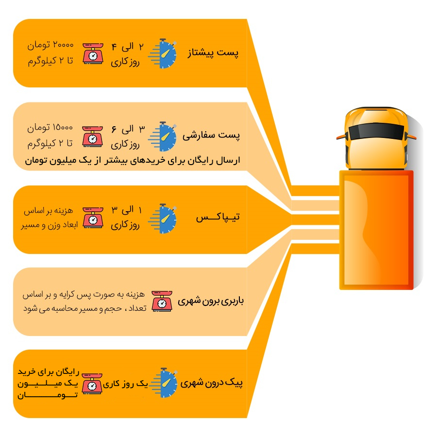 2. در شهرهایی غیر از تهران، سفارش ها توسط تیپاکس، پست و سایر سرویس های ارائه دهنده خدمات حمل کالا، از قبیل باربری‌ های برون شهری نیز ارسال می گردد که در ادامه شرح داده شده است.